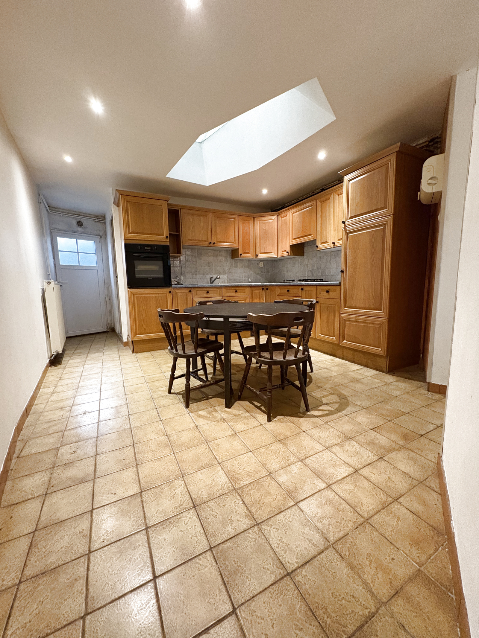 Vaste salon-séjour lumineux donnant sur une grande cuisine entièrement équipée, salle de bain.