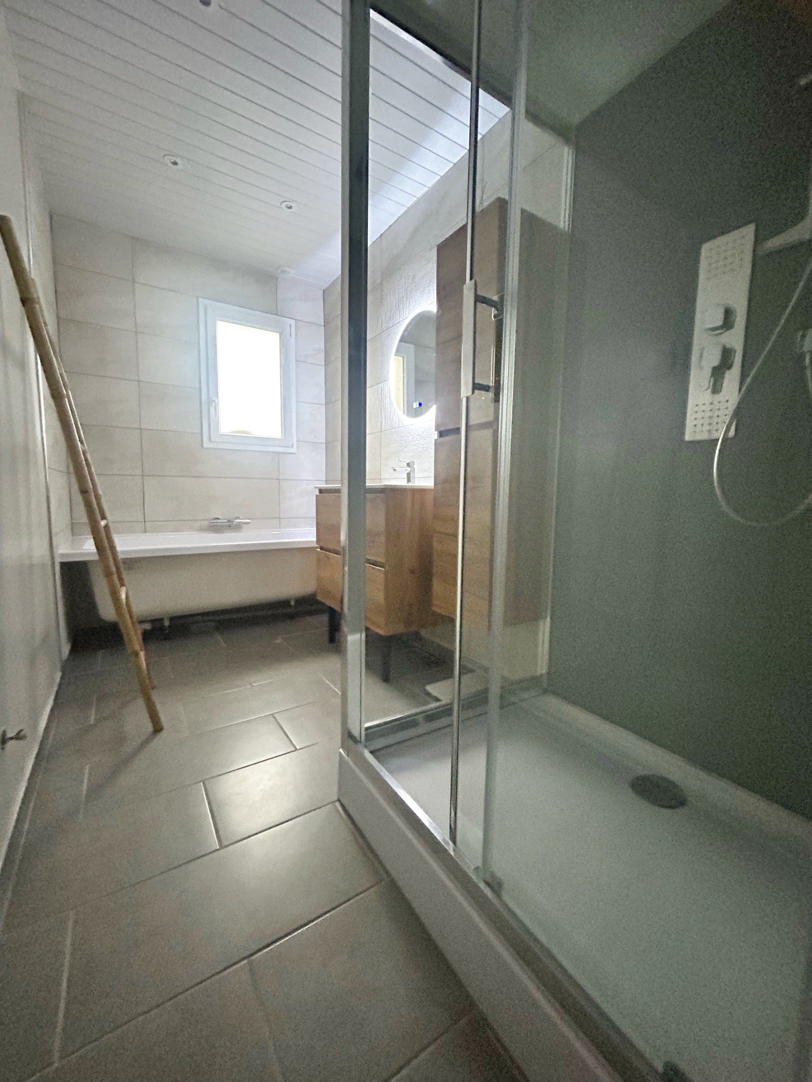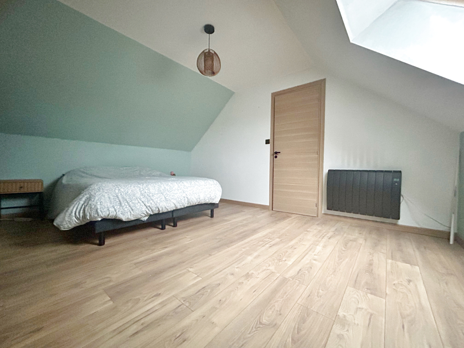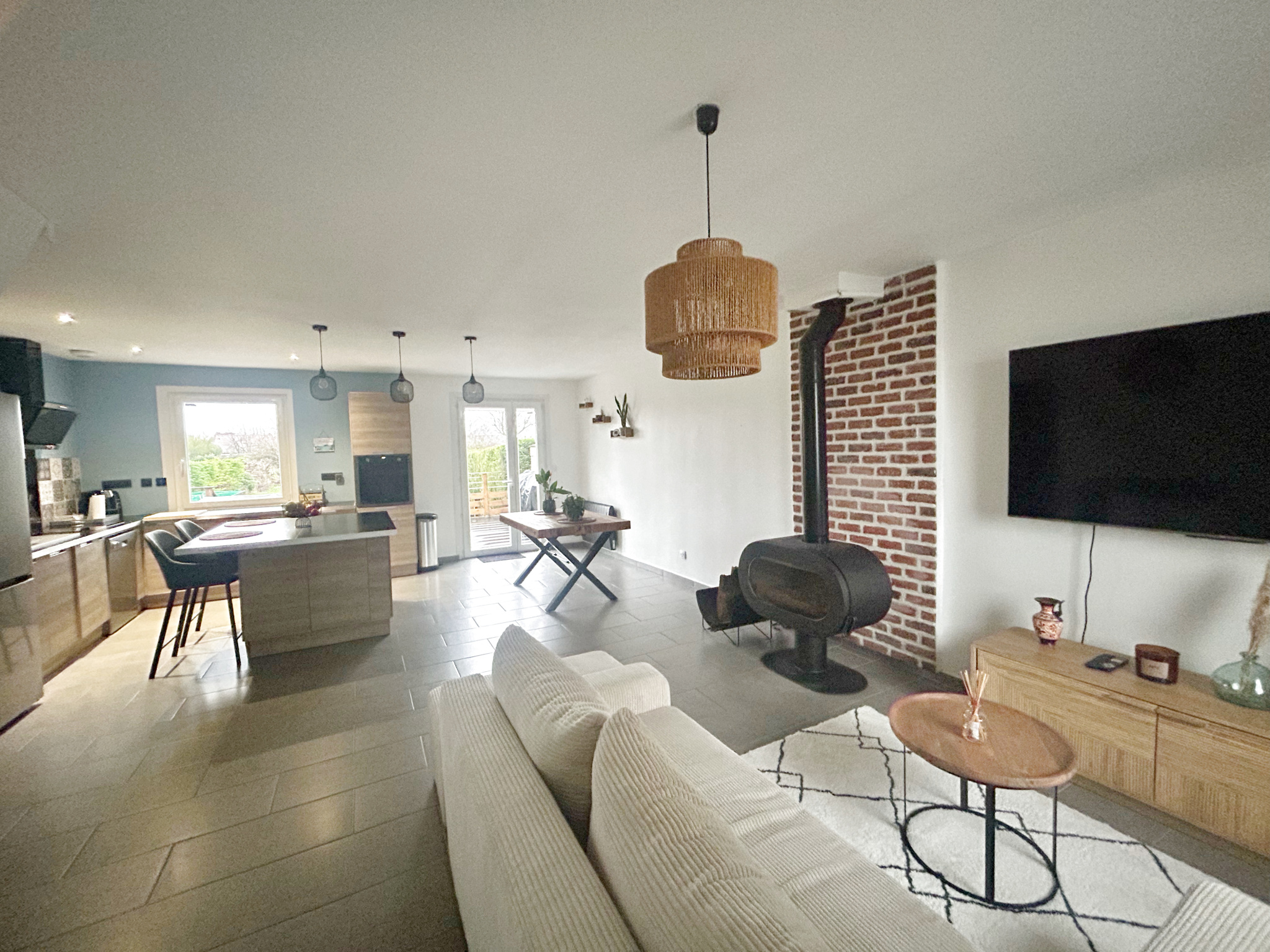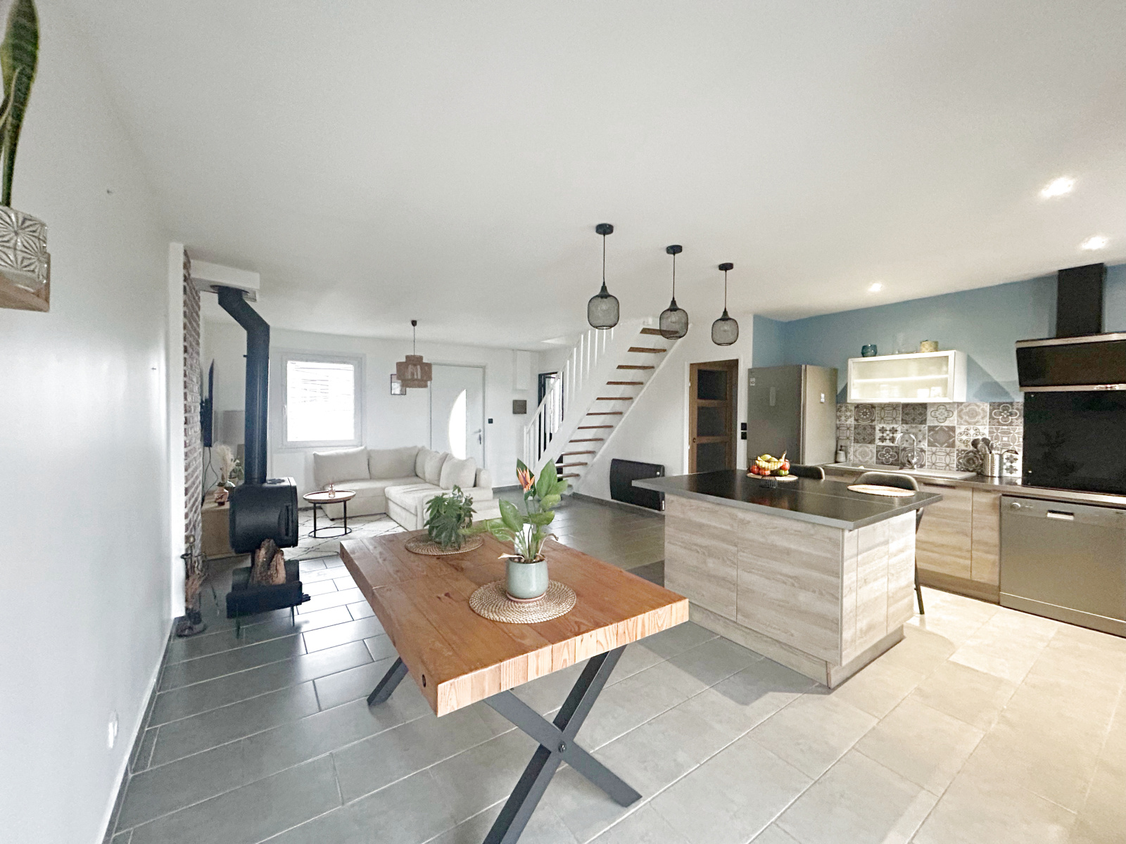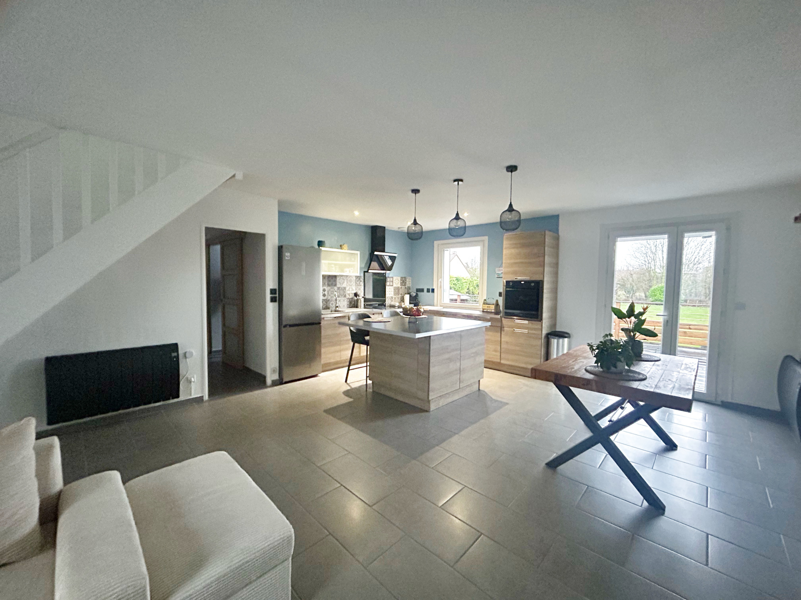 Maison de plus de 110m² comprenant au rez-de-chaussée : un grand salon-séjour, avec une cuisine équipée meublée ouverte sur le séjour, un poêle à bois, une buanderie, wc, salle de bain avec douche et baignoire, 2 chambres.