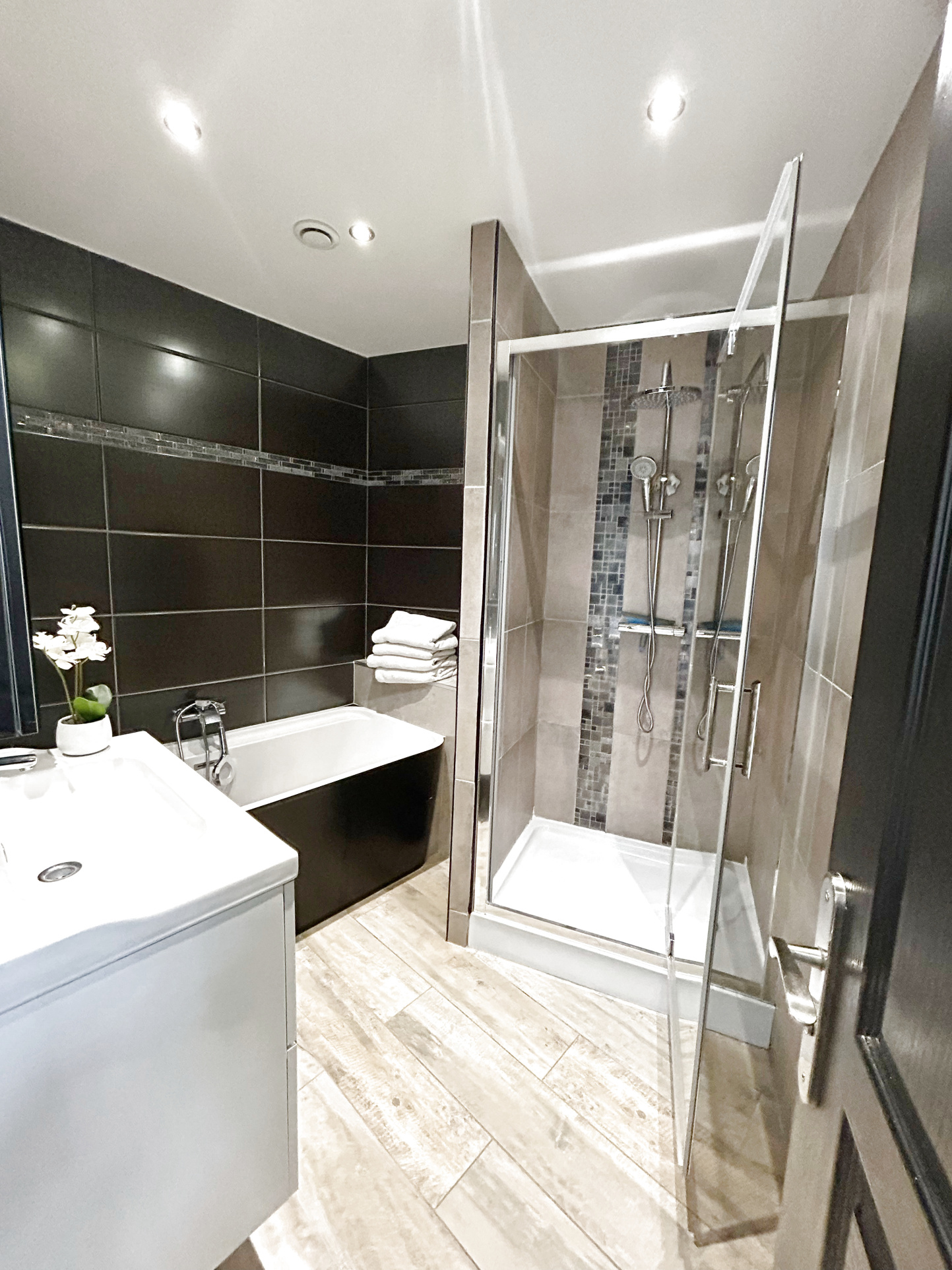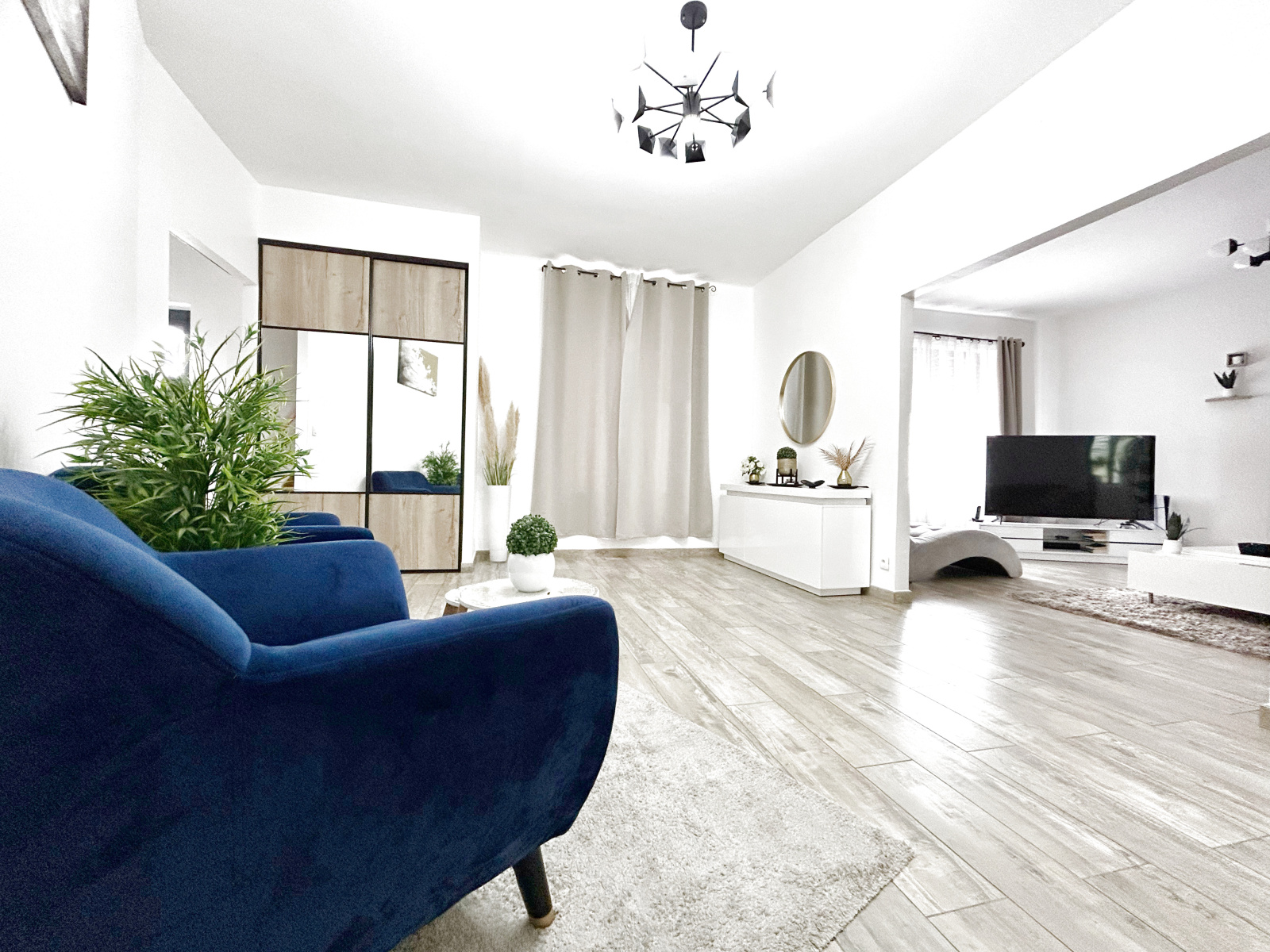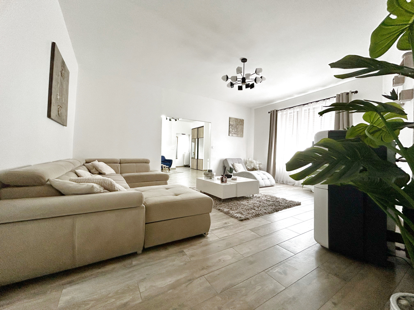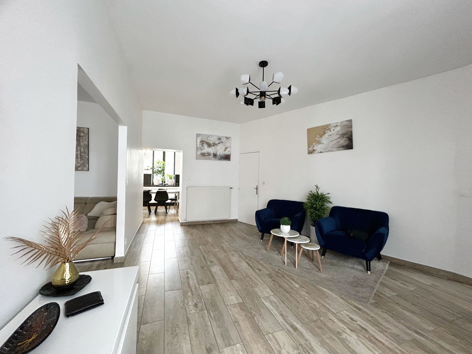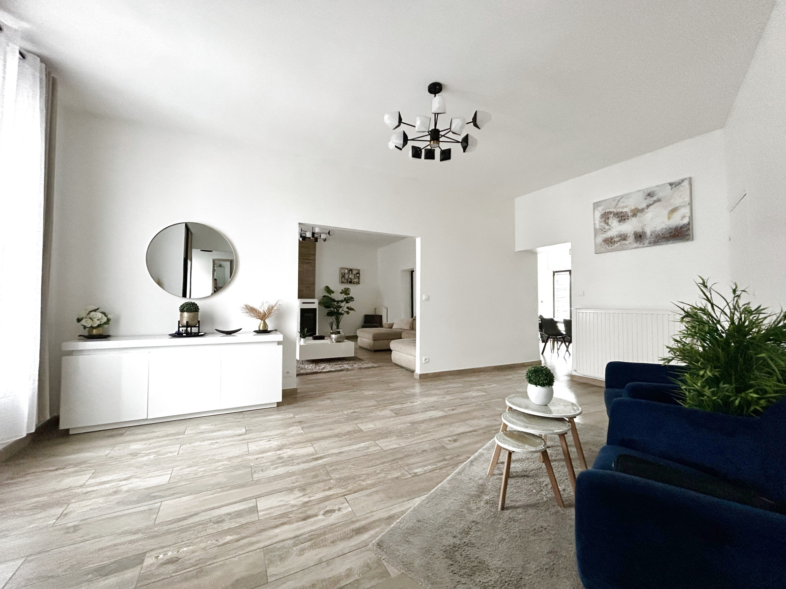 Hall, vaste salon et vaste séjour, grande cuisine entiérement équipée, grande salle de bain ( baignoire et douche à l'italienne, seche serviettes), laverie.