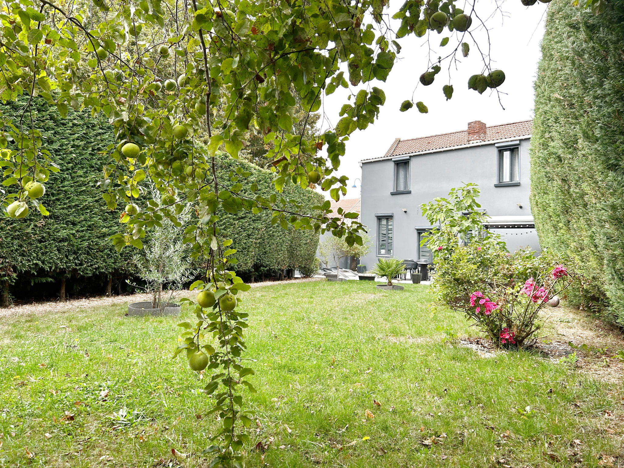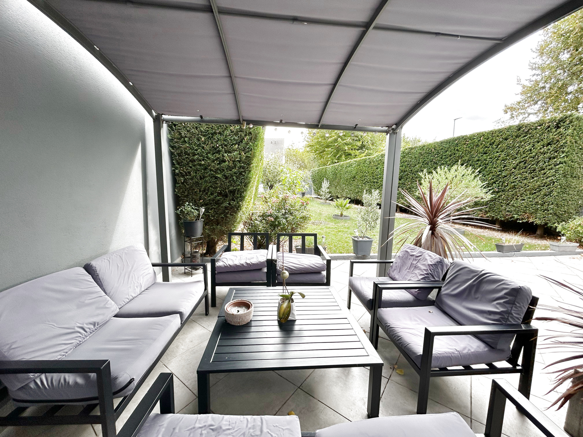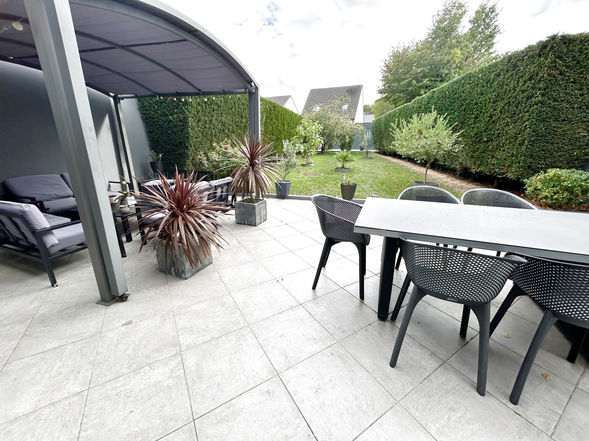 Grande terrasse avec pergola, beau jardin et 2 places de stationnement.