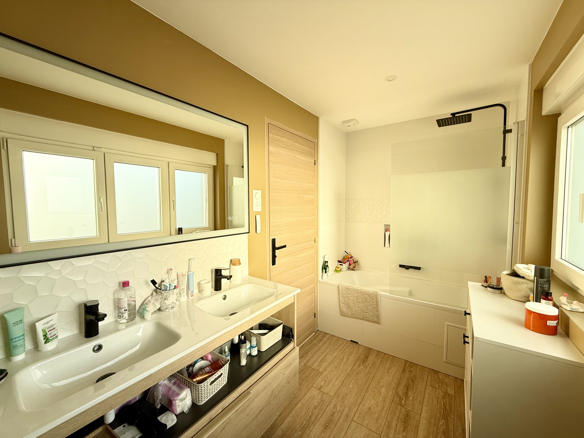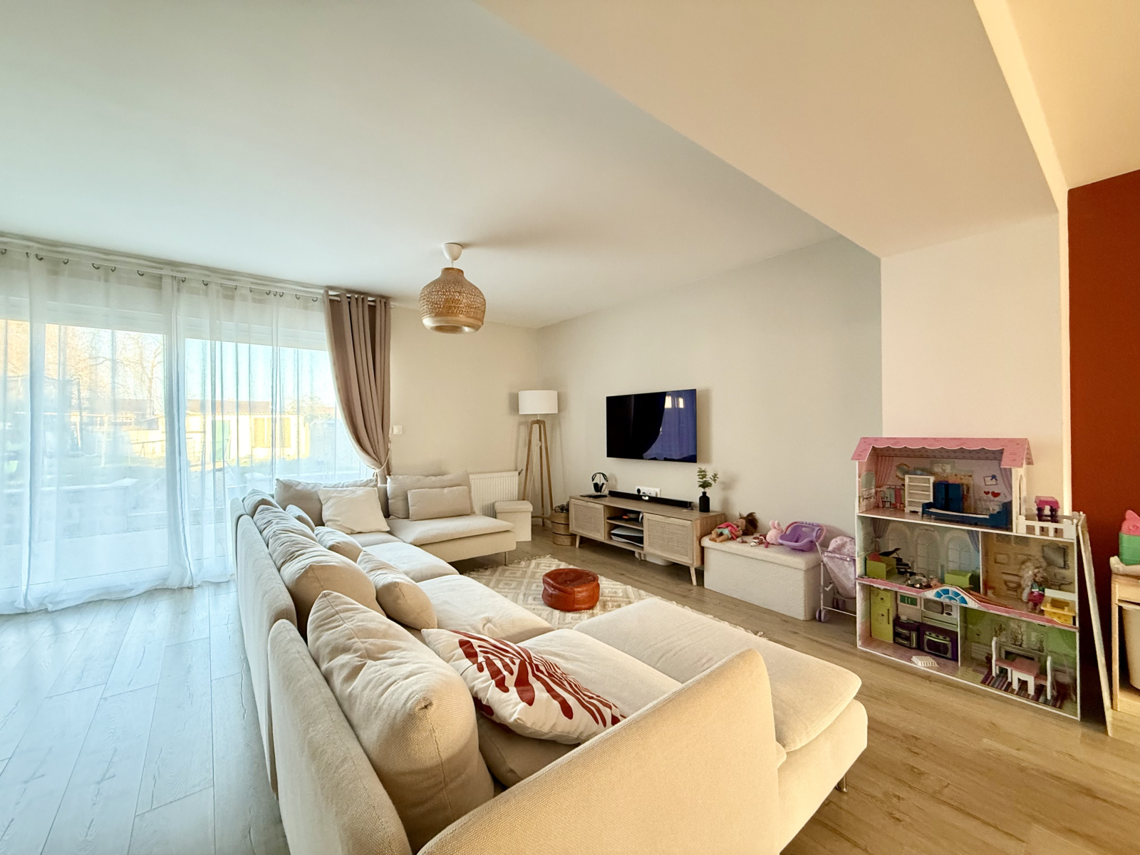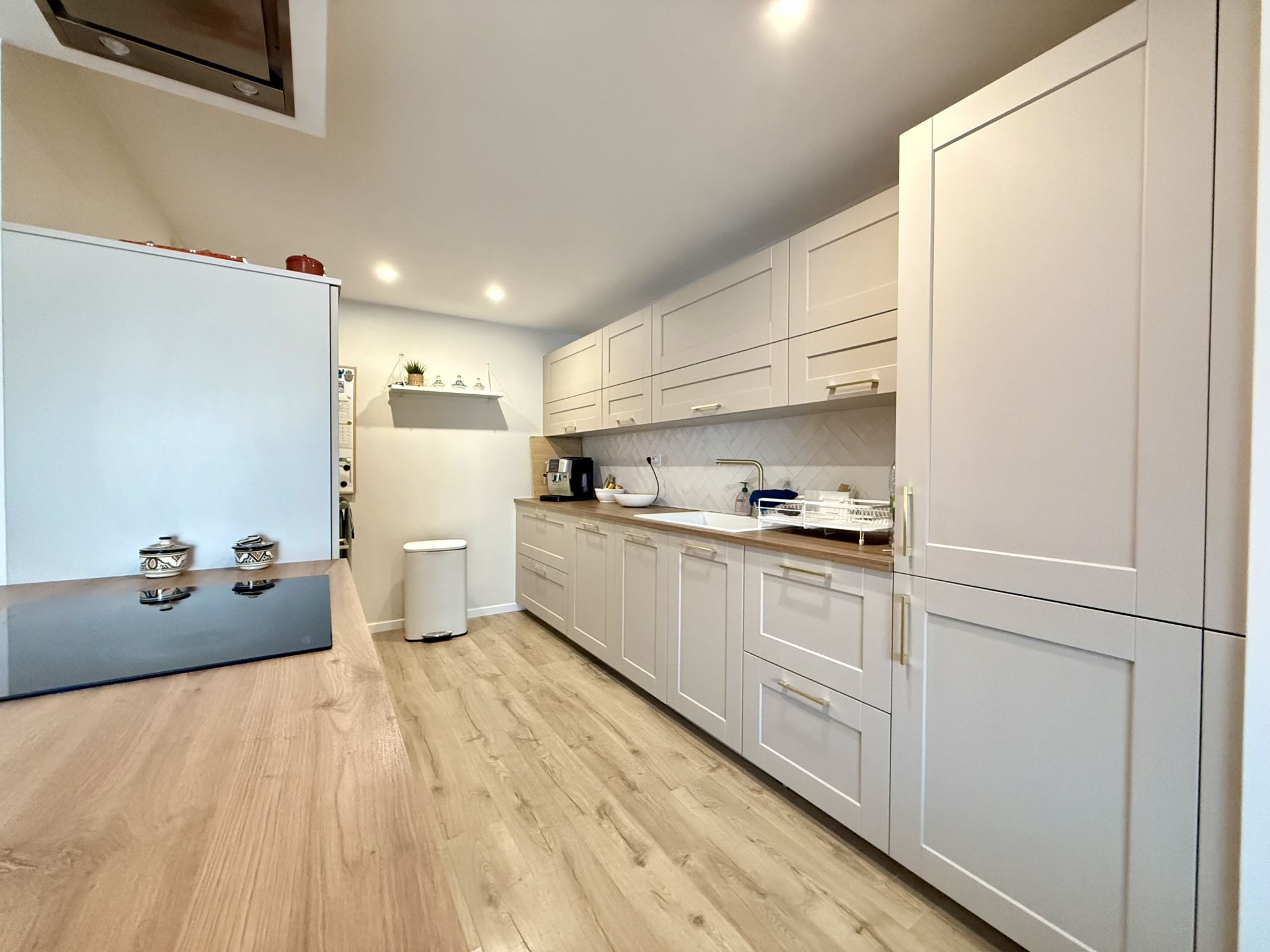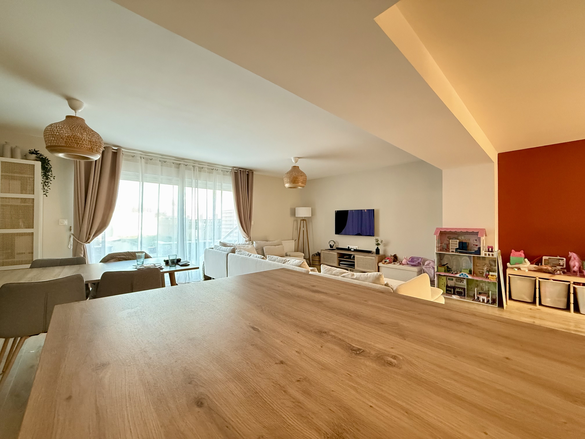 Au rez-de-chaussée, vous profiterez d’un vaste séjour lumineux avec cuisine équipée ouverte, offrant une surface totale de 61 m², ainsi que d’une buanderie, de WC séparés et d’un garage.