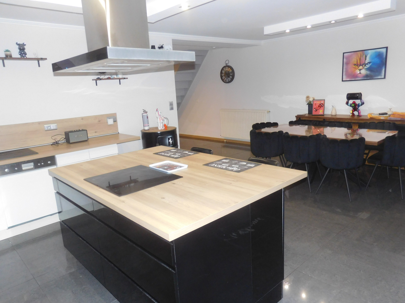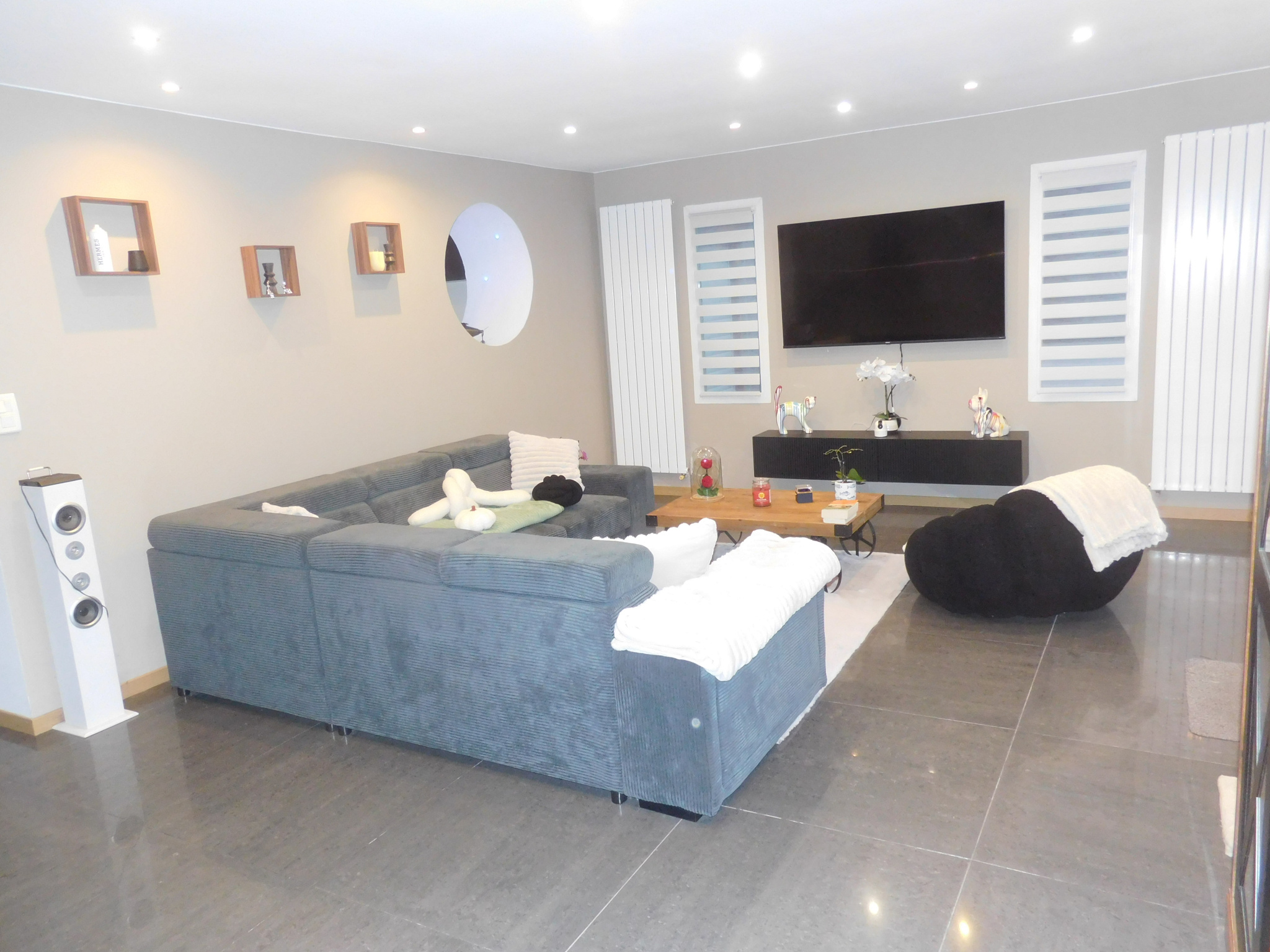 un salon de 33 m², une cuisine ouverte sur la salle à manger de 33m², une salle de bain avec douche et baignoire, une buanderie et un wc.
