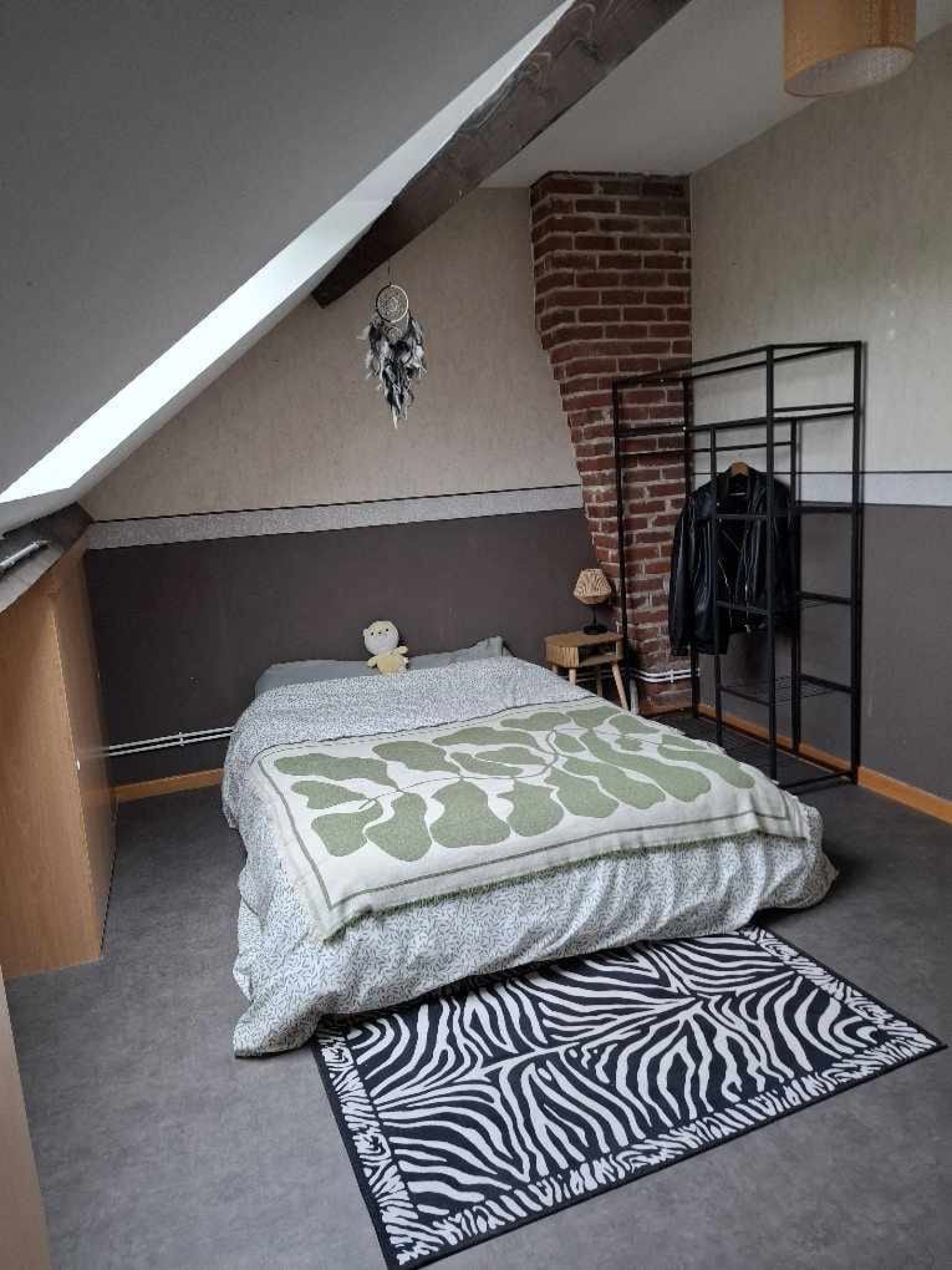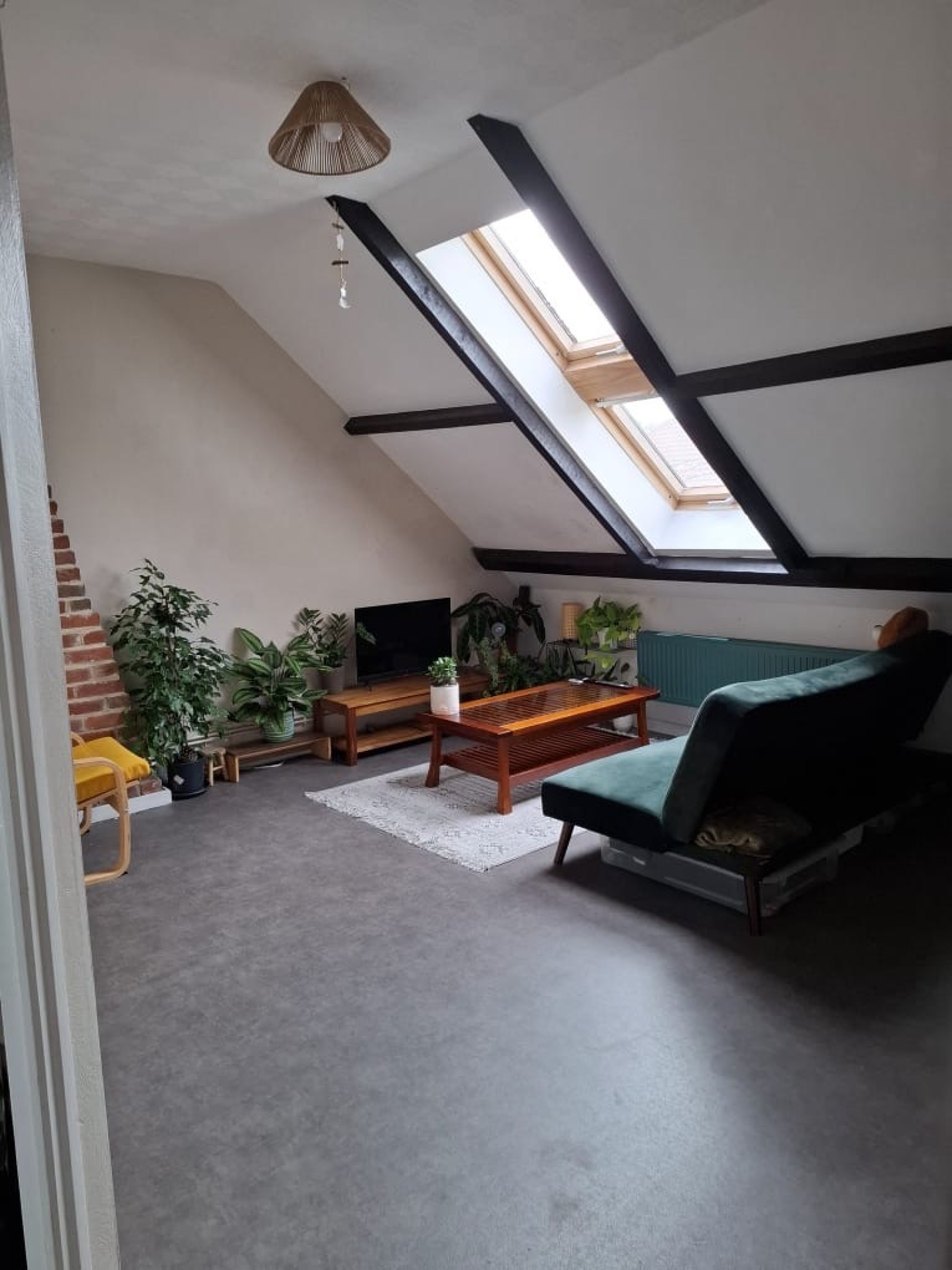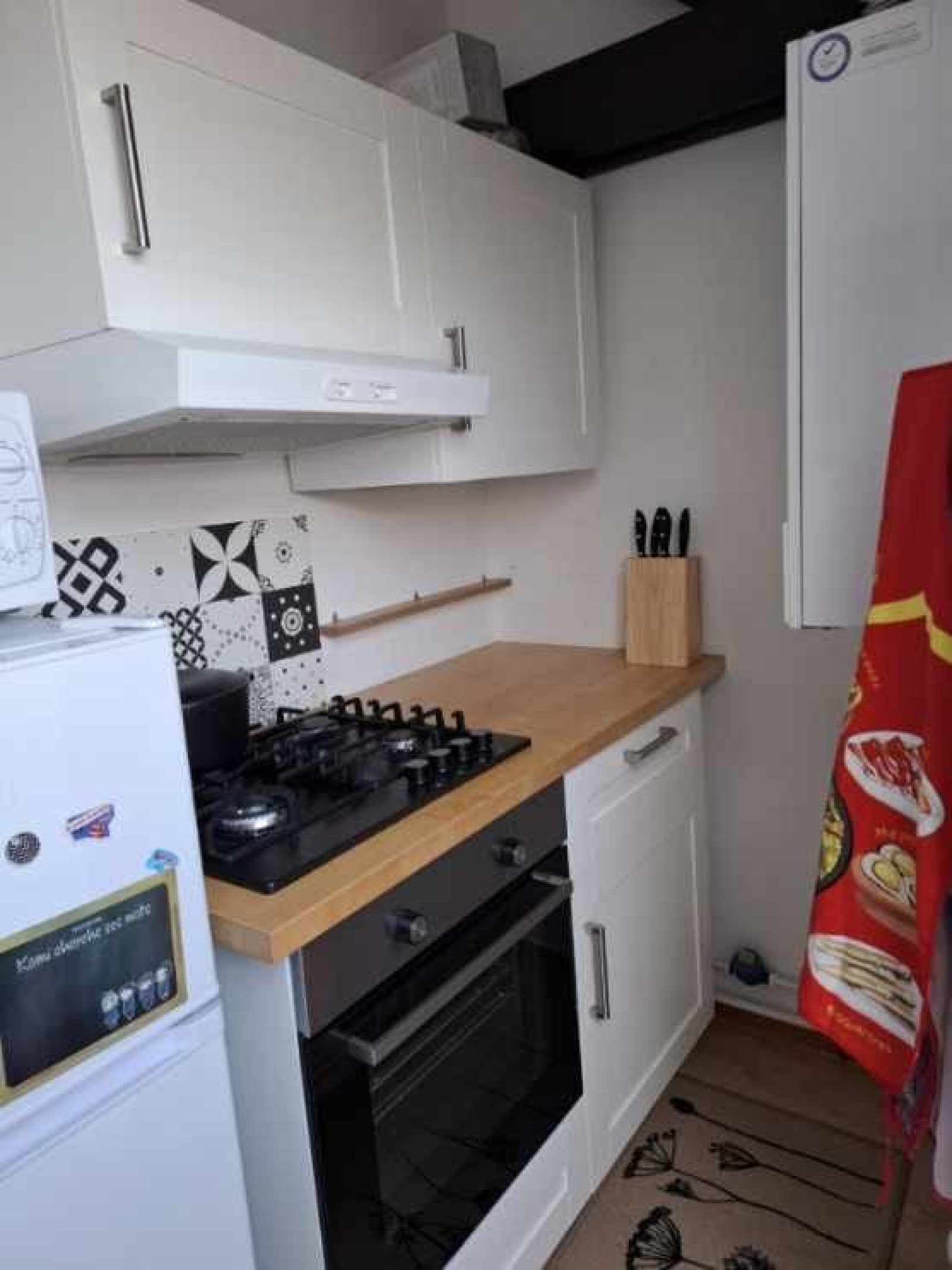 Il est composé d'un séjour avec un joli charme, d'une cuisine équipée (four, plaque, hotte, évier, lave-vaisselle).