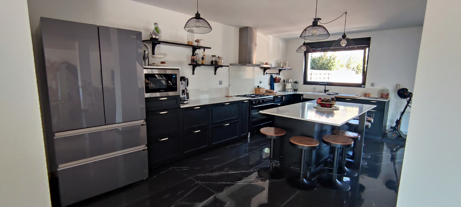 Une belle entrée desservant un grand salon-séjour ouvert sur une très belle cuisine equipée de plus de 70m² donnant sur la double terrasse.
