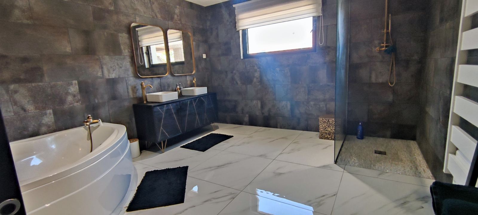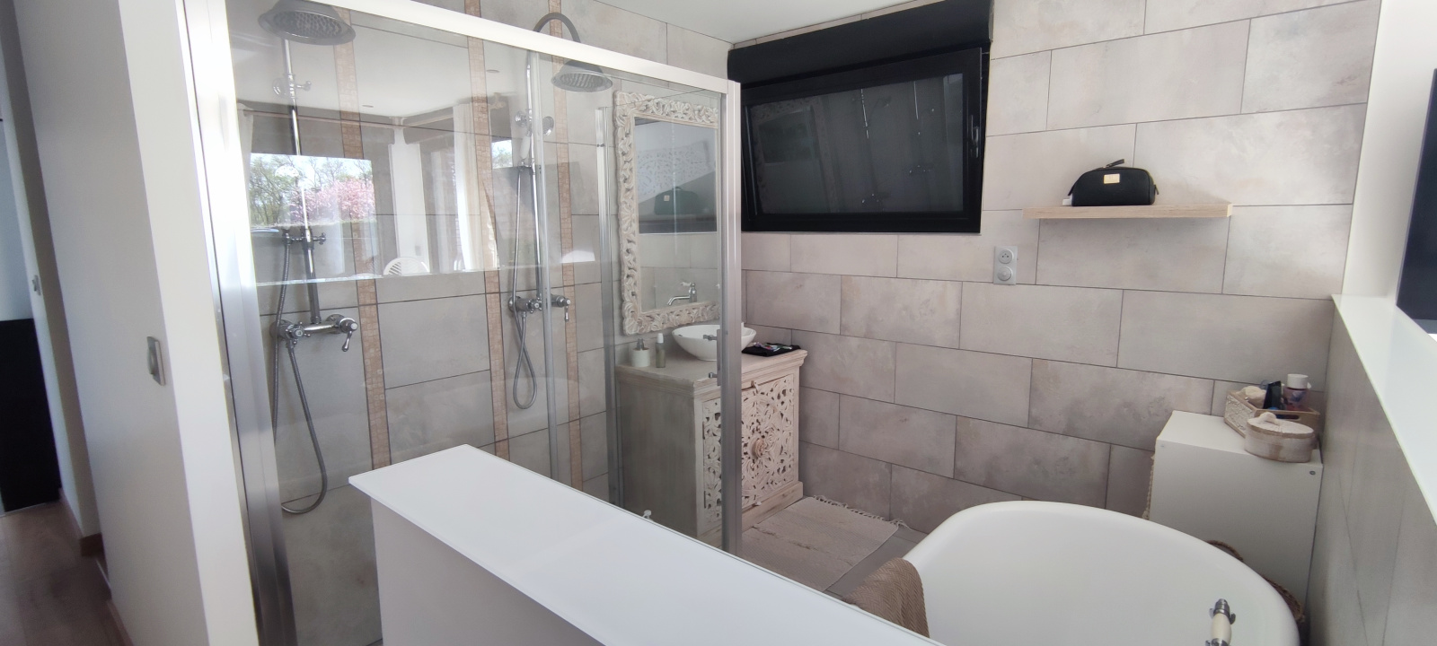 Une très grande salle de bain, un wc, et un espace bureau en mezzanine de plus de 30m².