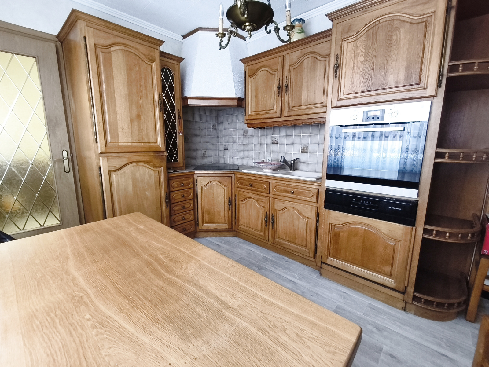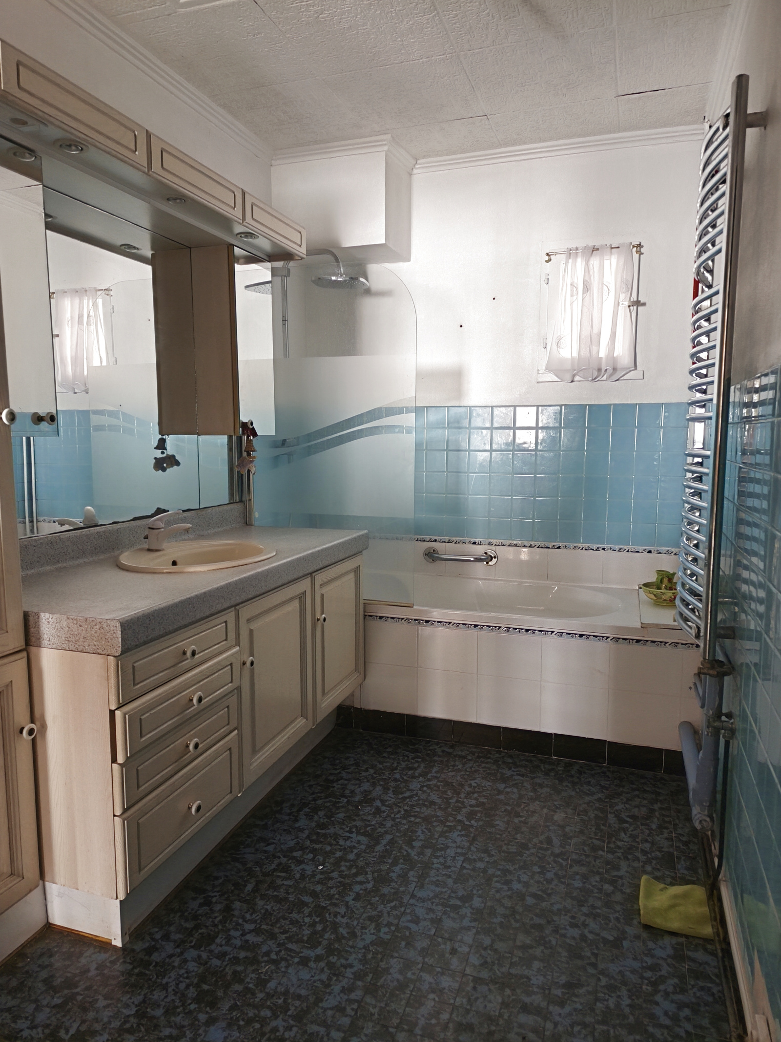 Vaste salon-séjour de plus de 40 m², grande cuisine entiérement équipée, salle de bain.