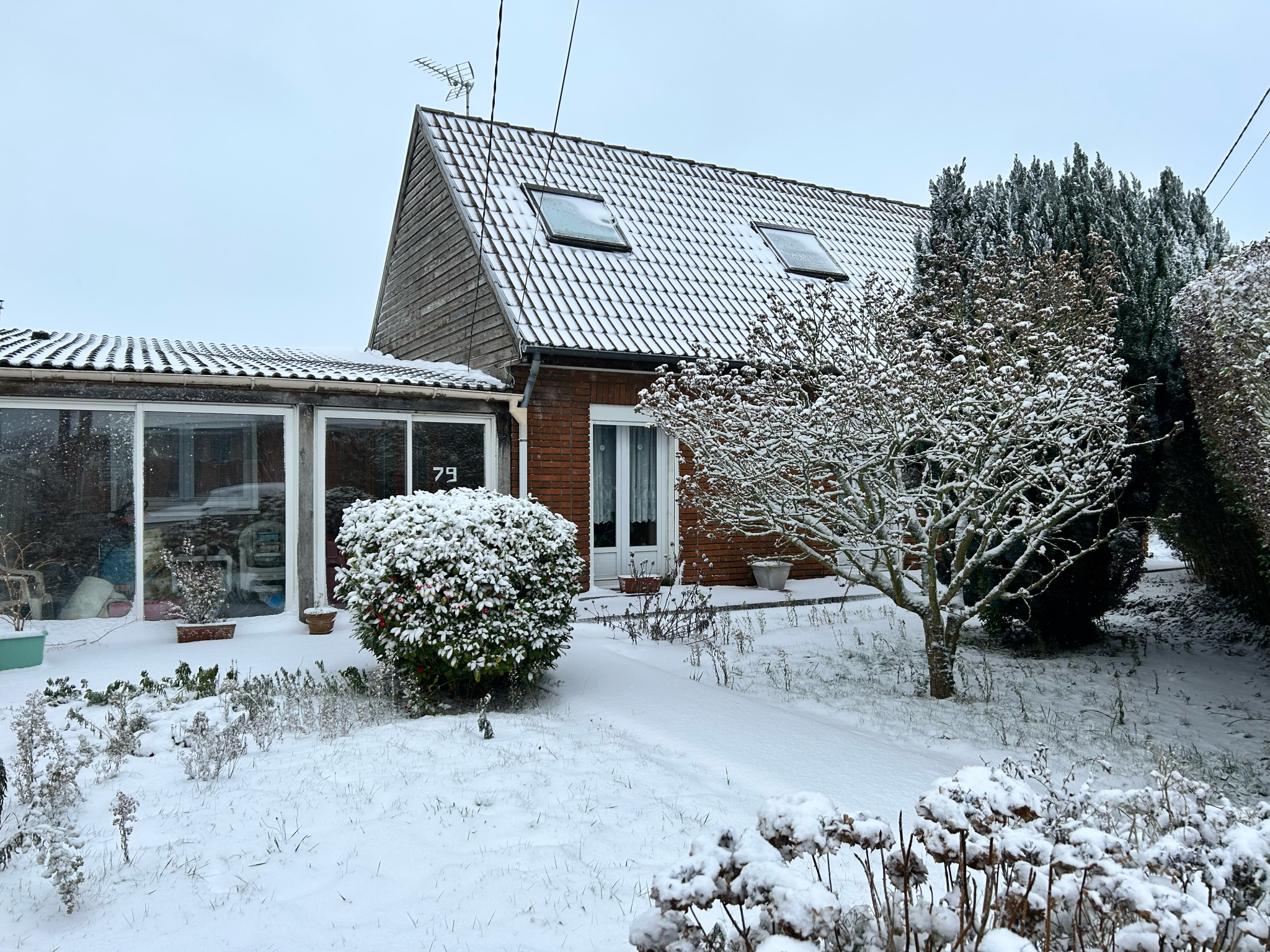 Un jardin en facade et un garage à rénover.